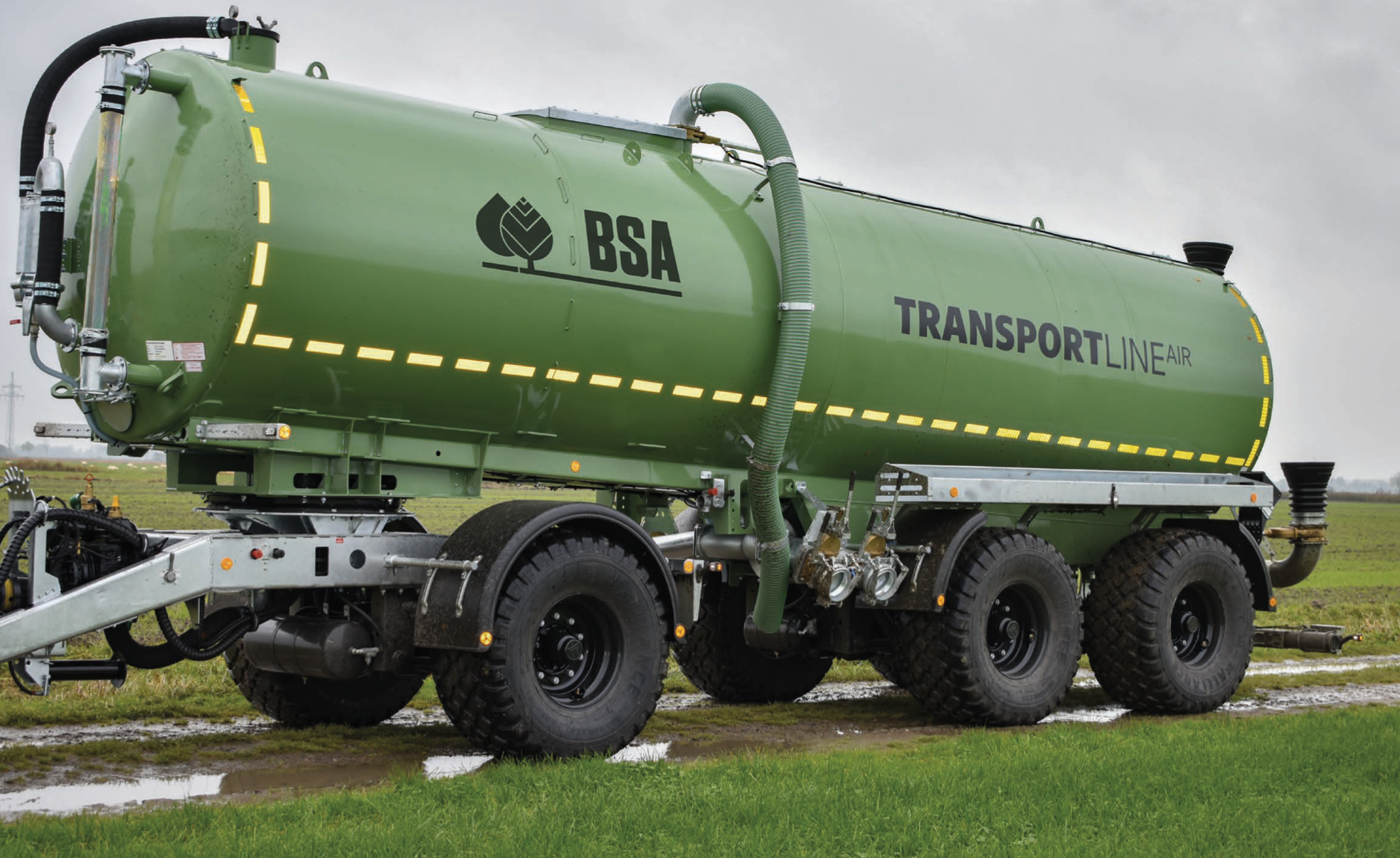 Die BSA TRANSPORTLINE wird nach der bewährten BSA-Stahlfasstechnik gefertigt und ist sowohl innen als auch außen feuerverzinkt. Ein serienmäßiges Luftfederfahrwerk und Druckluftbremsen mit ALB verleihen ihm hervorragende Straßen-Schnelläufer-Eigenschaften. Ein standardmäßiger Einfülldom mit großem Schiebedeckel ermöglicht eine einfache Fremdbefüllung von oben. Zudem ist ein serienmäßiger Andock-Elastiktrichter an der oberen Rückseite angebracht, der es den Ausbringfässern erlaubt, die Gülle schnell über einen Saugarm abzusaugen. Schlauchablagekästen sowie eine Stützwinde mit zwei Geschwindigkeiten sind am Chassis montiert. Der TTW ist serienmäßig drucklos, kann jedoch optional mit einer großvolumigen, hydraulisch angetriebenen Schneckenpumpe ausgestattet werden. Eine serienmäßige LED-Beleuchtung rundet die professionelle Serienausstattung ab.